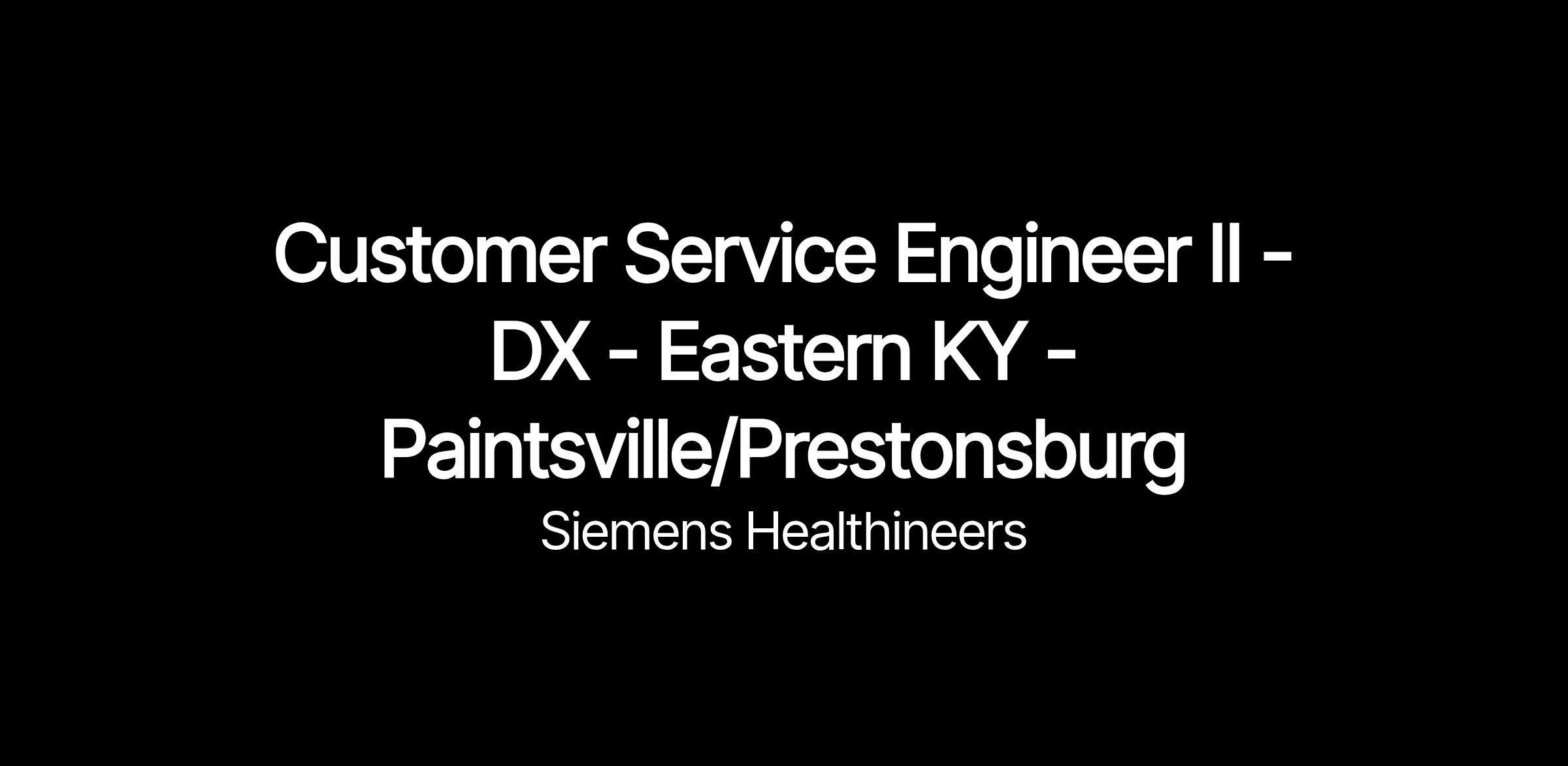 You will be servicing Diagnostic Equipment in the Eastern, KY - Paintsville/Prestonsburg area. Customer Service Engineer Level based on prior experience.