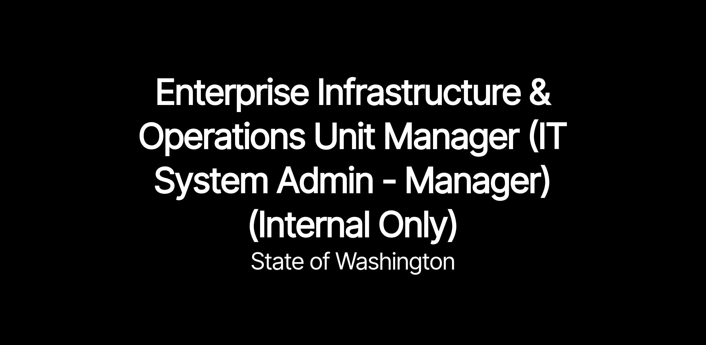 The Department of Ecology is hiring an Enterprise Infrastructure & Operations Unit Manager (IT System Administration - Manager) (Internal Only) within the Information Technology Services Office (ITSO).