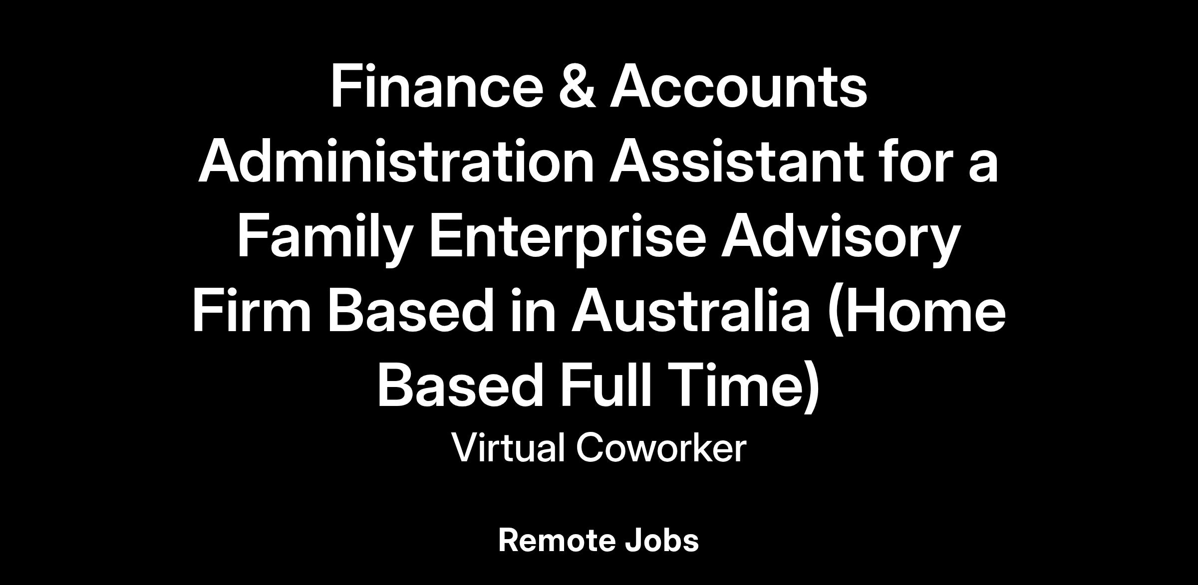 https:\/\/www.linkedin.com\/company\/virtual\-coworker"}],"isMobile":false,"iframe":"true","jobType":"Full time","applyName":"Apply Now!","zsoid":"8208015","FontFamily":"Arial, Helvetica, sans\-serif","jobOtherDetails":[{"fieldLabel":"Job Category","uitype":2,"value":"Accounting\/Bookkeeping"},{"fieldLabel":"Work Schedule","uitype":1,"value":"Monday \- Friday, 9 AM \- 5 PM Australian Eastern Standard Time"},{"fieldLabel":"Hours Per Day","uitype":2,"value":"Part Time â 4 hours per day"},{"fieldLabel":"Industry","uitype":2,"value":"Consulting"},{"fieldLabel":"Client Location","uitype":2,"value":"Australia"},{"fieldLabel":"Work Location","uitype":1,"value":"Home Based \- Philippines"},{"fieldLabel":"City","uitype":1,"value":"Melbourne"},{"fieldLabel":"State\/Province","uitype":1,"value":"Victoria"},{"fieldLabel":"Zip\/Postal Code","uitype":1,"value":"3000"}],"headerName":"Finance & Accounts Administration Assistant for a Family Enterprise Advisory Firm Based in Australia (Home Based Full Time)","widgetId":"147741000000390320","isJobBoard":"false","userId":"147741000000027001","attachArr":[],"customTemplate":"3","isCandidateLoginEnabled":true,"jobId":"147741000069217013","FontSize":"12","location":"Melbourne","embedsource":"CareerSite","logoId":"idwop0ece2fcac21a443ba16938fb832bdc3b"}