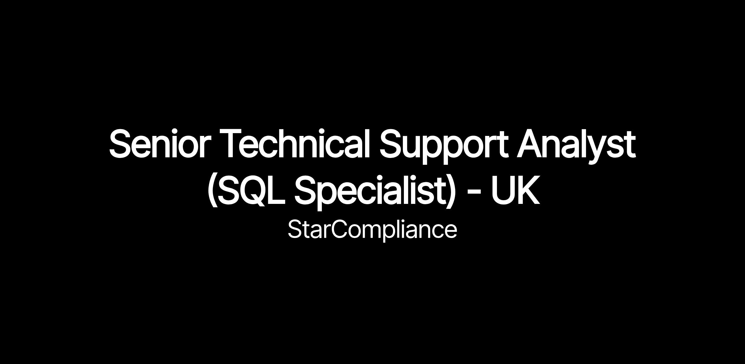 StarCompliance is seeking an experienced Senior Technical Support Analyst (SQL Specialist), based in the United Kingdom to join our dynamic, client-facing Client Support Services team.
