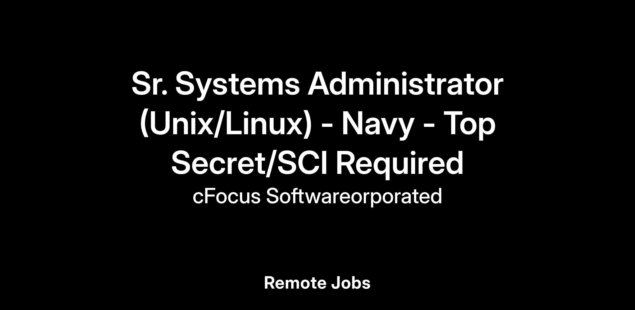 cFocus Software seeks a Sr. Systems Administrator (Unix/Linux) to join our program supporting the Department of Defense (DoD). This position is remote. This position requires the ability to obtain a Top Secret/SCI clearance.Qualifications:- Six (6) years of professional experience in Unix and/or Linux system administration of networks and software systems.